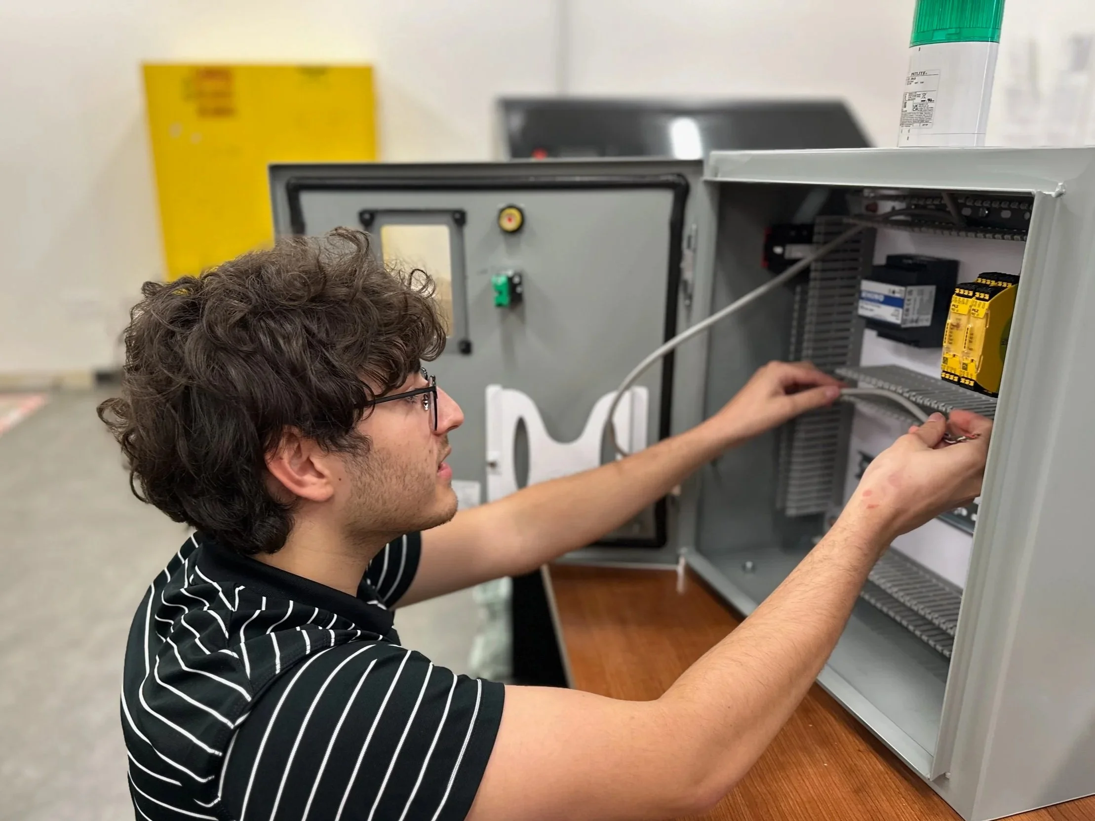 Niyan Patel, a junior at Purdue University, building a safety circuit during his Vartega internship.